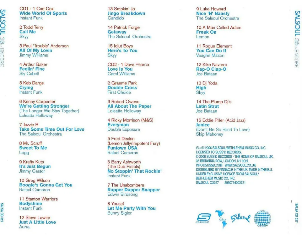 #InstantFunk #Skyy #JimmyWilliams #SlyCabell #LoleattaHolloway #TheSalsoulOrchestra #Logg #JimmyCastor #RafaelCameron #Aurra #Candido #CarolWilliams #FirstChoice #DoubleExposure #EdwinBirdsong #BunnySigler #Lemon #VaughnMason #JoeBataan #SkipMahoney #CarlCox #ToddTerry #Paul’Trouble’Anderson #ArthurBaker #KebDarge #KennyCarpenter #JazzieB #Mr.Scruff #KraftyKuts #GregWilson #StantonWarriors #SteveLawler #Smokin’Jo #PatrickForge #IdjutBoys #DavePearce #GraemePark #RobertOwens #RickMorrison #M&S #FredDeakin #LemonJelly #ImpotentFury #BarryAshworth #TheDubPistols #TheUnabombers #Yousef #LukeHoward #AManCalledAdam #RogueElement #KikoNavarro #DjYoda #ThePlumpDj’s #EddiePiller #AcisJazz